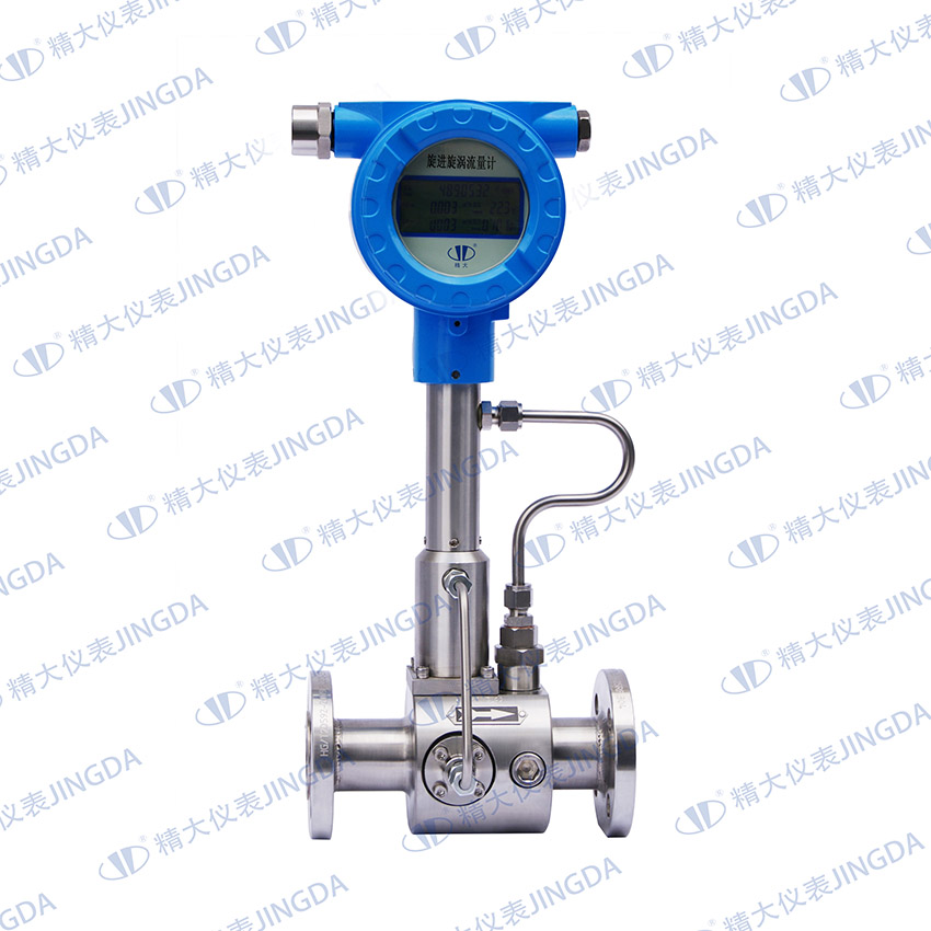 當(dāng)沿著軸向流動(dòng)的流體進(jìn)入流量計(jì)入口時(shí),螺旋形葉片強(qiáng)迫流體進(jìn)行旋轉(zhuǎn)運(yùn)動(dòng),于是在旋渦發(fā)生體中心產(chǎn)生螺旋流,旋渦流在文丘利管中旋進(jìn),到達(dá)收縮段后,因回流作用強(qiáng)迫進(jìn)行旋進(jìn)式二次旋轉(zhuǎn)。此時(shí)旋渦流的旋轉(zhuǎn)頻率與介質(zhì)流速成正比,并為線性。兩個(gè)壓電傳感器檢測(cè)的微弱電荷信號(hào)同時(shí)經(jīng)前置放大器放大、濾波、整形處理后,變成兩路頻率與流速成正比的脈沖信號(hào)進(jìn)行比較和判斷,剔除干擾信號(hào),并同固定在殼體上的溫度傳感器、壓力傳感器檢測(cè)到溫度、壓力信號(hào)一起,送入智能化積算儀進(jìn)行運(yùn)算處理,即可求得流量及相關(guān)數(shù)據(jù)。