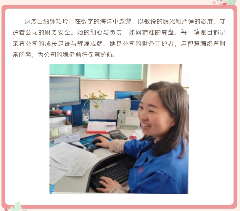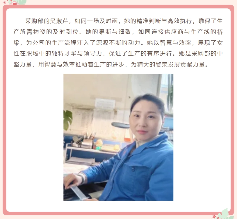 在這個春意盎然、萬物復(fù)蘇的美好時節(jié),我們迎來了三八婦女節(jié),請讓我們的目光深情地投向那些在公司各個崗位默默耕耘、熠熠生輝的女性員工。她們以卓越的專業(yè)技能為精大的蓬勃發(fā)展添磚加瓦,更以獨(dú)特的女性魅力,在職場上綻放出一抹抹絢爛的光彩,猶如璀璨星辰,照亮前行的道路。