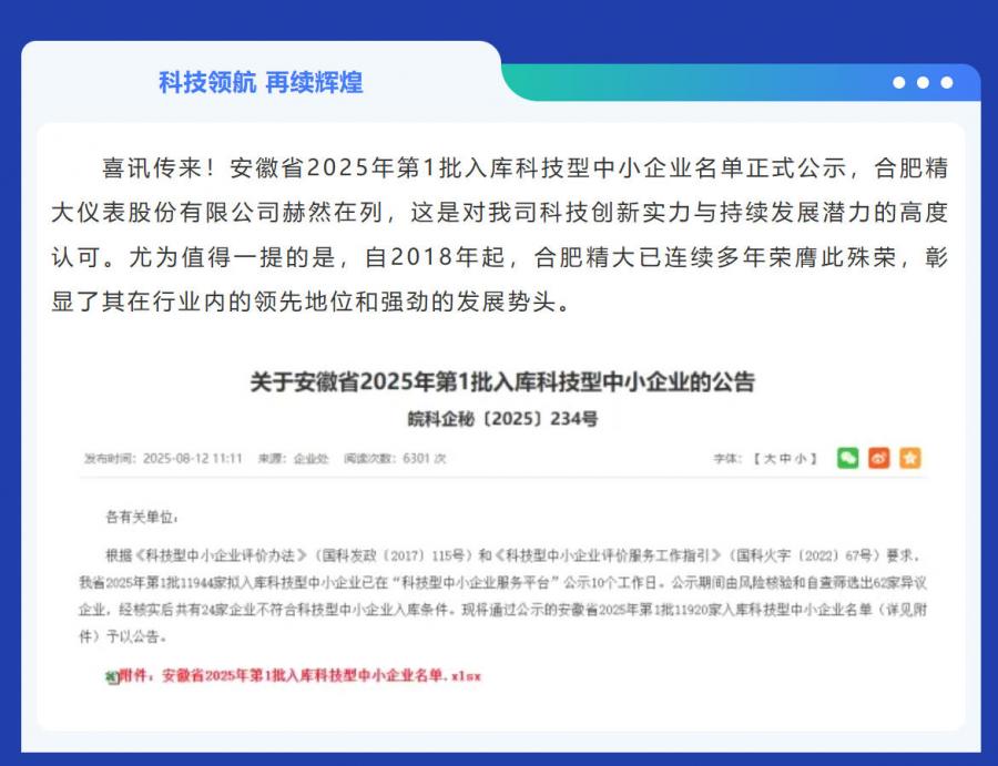 科技領(lǐng)航,再續(xù)輝煌!——合肥精大儀表股份有限公司再次入選安徽省科技型中小企業(yè)名單
